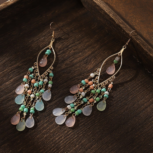 Hollow Leaf Shape Colorful Droplet Glass Tassel Dangle Earrings Bohemian Vocation Style Alloy Jewelry Trendy Holiday Earrings