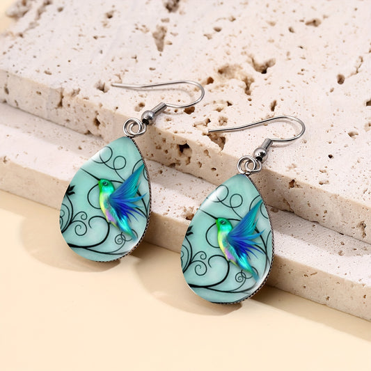 [Popular Choice] Elegant Vintage Hummingbird & Floral Pattern Teardrop Glass Earrings for Women - Stainless Steel Hooks, Lightweight, Perfect for Casual Attire, Gemstone