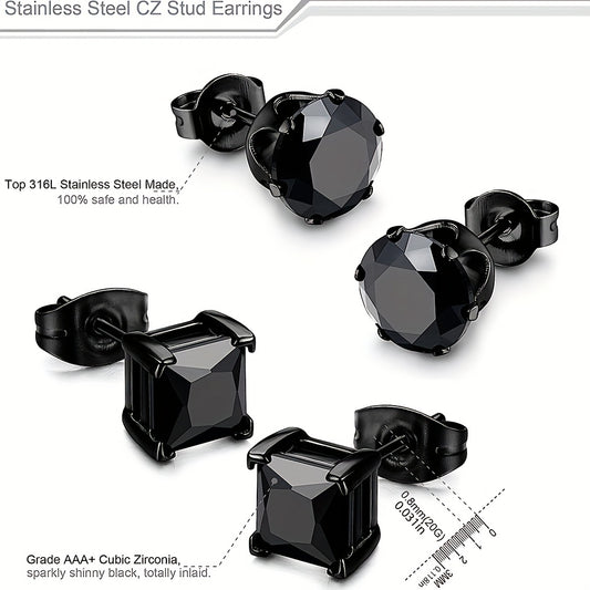 2 Pairs Stainless Steel Unisex CZ Stud Earrings - Durable Hypoallergenic, Jet Black, Sparkling Cubic Zirconia, Perfect for Men & Women