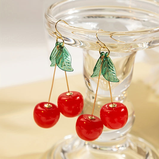 [Cute Cherry Earrings] Exquisite Cherry Drop Earrings - Handmade Resinous Material - Delicate Gift For Students with Green Leaf Cartoon Cute Temperament
