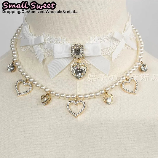 Handmade Choker Necklaces Double Pearl bow love jewelry gemstone sweet Cute Kawaii Collar Lolita Collarbone Chain Cecklace Women