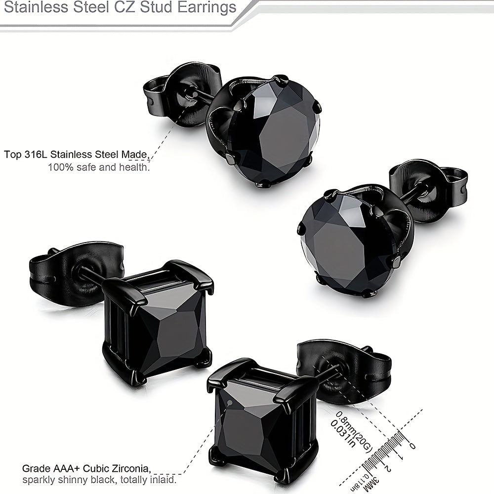 2 Pairs Stainless Steel Unisex CZ Stud Earrings - Durable Hypoallergenic, Jet Black, Sparkling Cubic Zirconia, Perfect for Men & Women